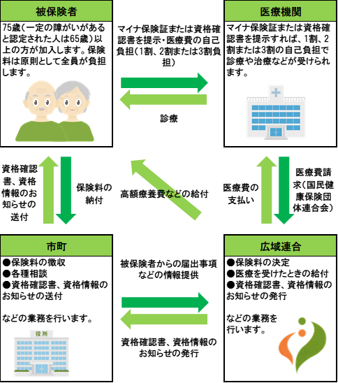 広域連合は保険料の賦課とその決定、被保険者の皆様が医療を受けたときの給付、保健事業の計画とその推進などを行います。